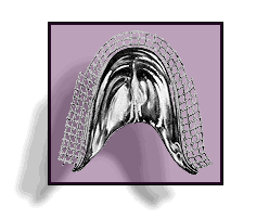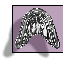 | (19) Full base extended to ridge with ribbon tag retention for cases where teeth will be set off ridge. Also made with stainless steel gauze retention without tags, no extra charge. Plain or stippled Viscoform® pattern S.021" or S.016". [Above] |