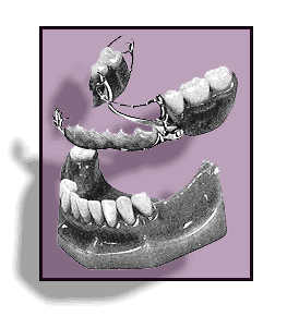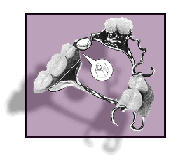 | (21) The right saddle is stress broken by using an attachment permitting slight vertical movement whilst preventing damage from excessive lateral displacement. [Above] | (22) Restoration of gingival contour with a hinged labial veneer and lock also giving increased retention. [Above] |